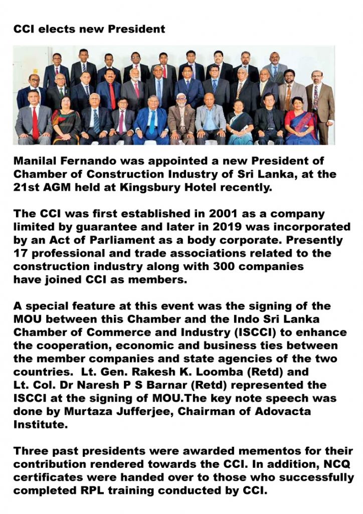 Another, cause for alarm is the undue delays in payments. Construction companies claim that only on road and school building contracts the total outstanding payments exceed Rs. 50 Billion. As construction companies operate on relatively low profit margins it is of paramount importance that they receive timely payments. Most construction companies go bankrupt not because of no profits but due to the inability to manage the cash flow. To guard against this in Singapore a ‘ Construction Industry Security of Payments Act” has ben enacted. Attempts by the Chamber of Construction Industry of Sri Lanka to have a similar law passed here has been to no avail to date. During these turbulent times it is imperative to have such an Act to protect the domestic construction industry.